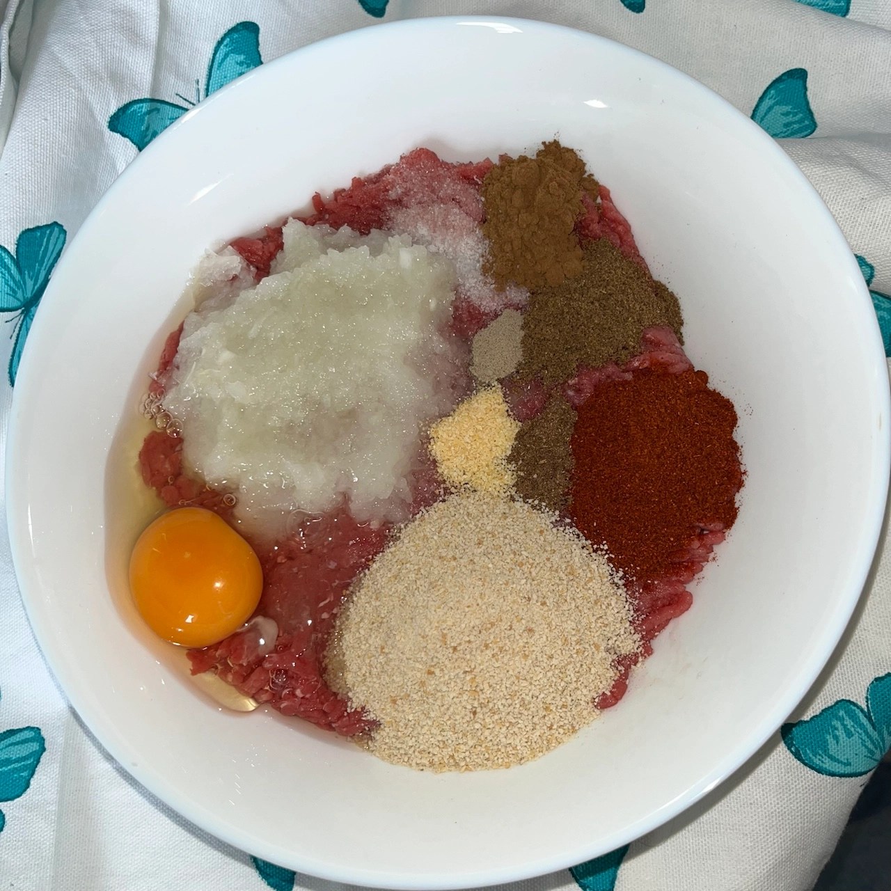 1. In a large bowl, combine ground meat, grated onion, breadcrumbs, egg and spices.