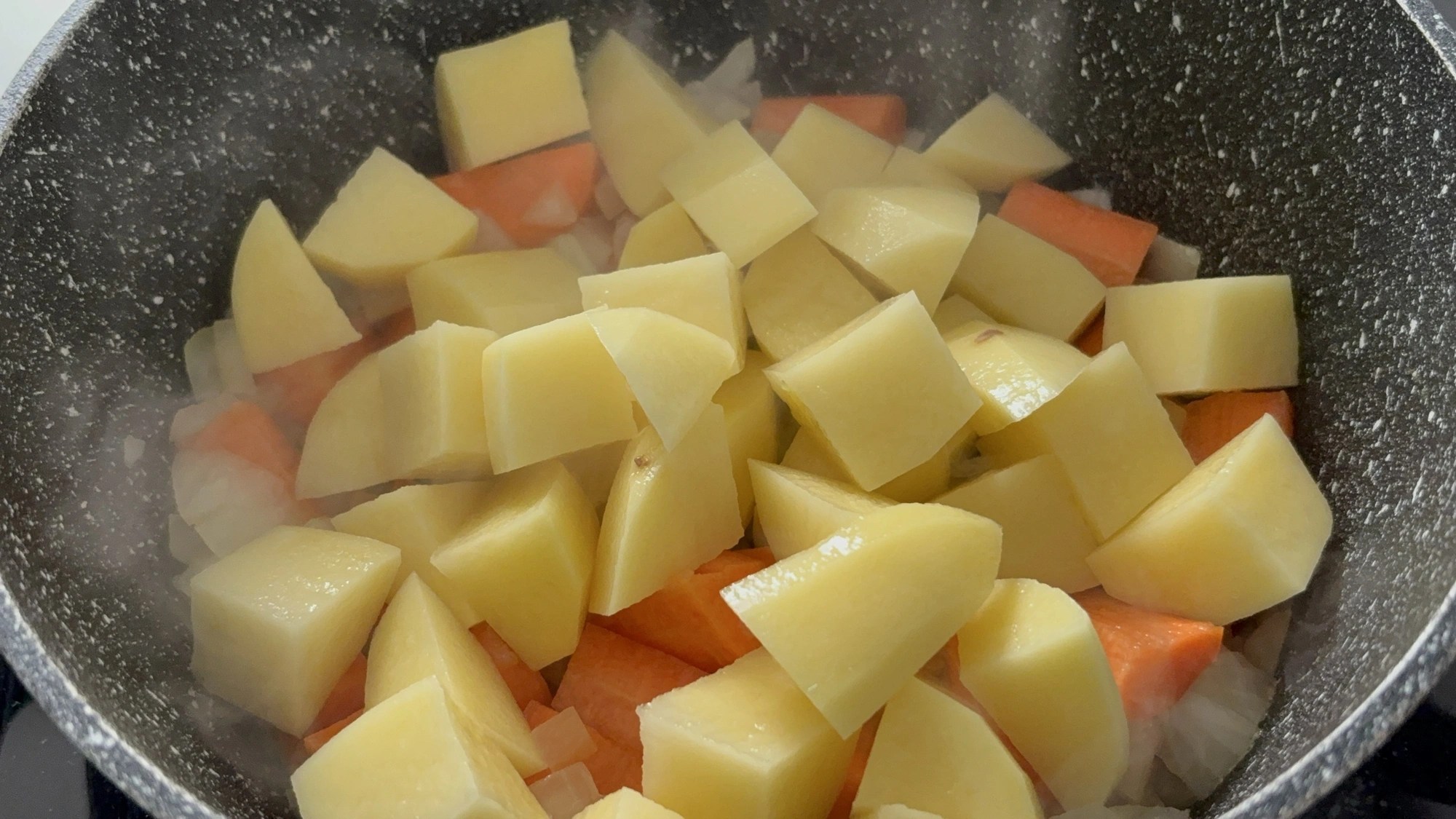 - Add the chopped carrots and potatoes to the pot and stir.Cover and simmer for 5 minutes.1 Medium Carrot, 2 Small Potatoes