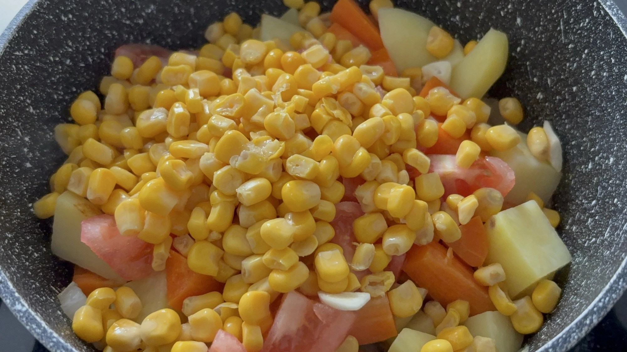 - Add the chopped tomato, minced or chopped garlic and sweet corn.1 Tomato, 2 Garlic Gloves, 1 Cup Sweet Corn