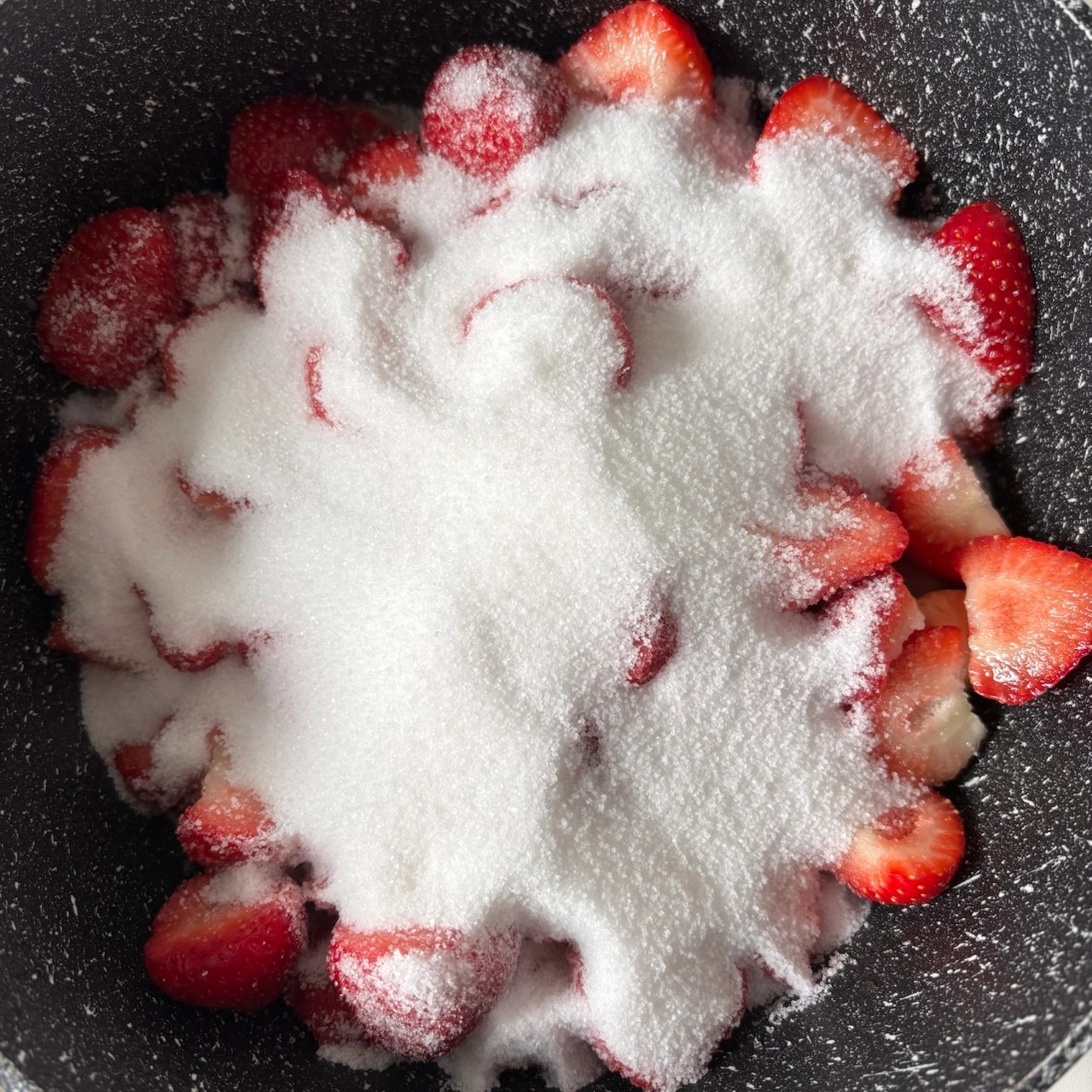 1. Transfer the prepped strawberries to your large pot. Add the sugar and fresh lemon juice. Give it a good stir.