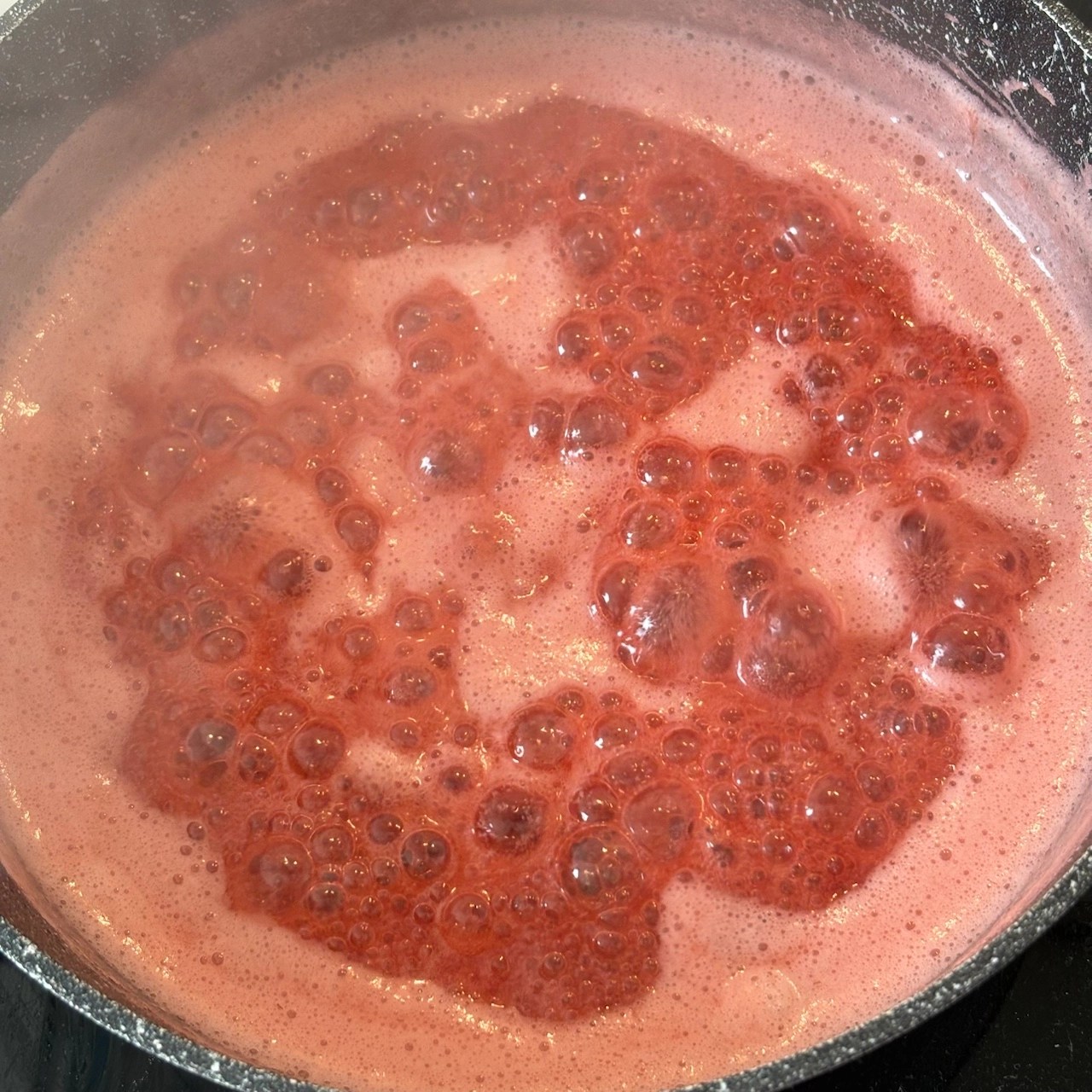 1. Place the pot over medium heat, stirring occasionally. The sugar will dissolve and, as it heats, the mixture will become quite fluid. Continue heating until it reaches a rolling boil (meaning it continues to bubble even when stirred).