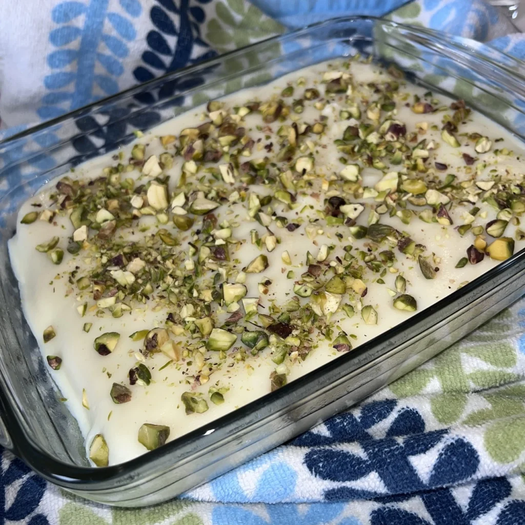 - Garnish the semolina cream with crushed pistachios.100 G Pistachio
