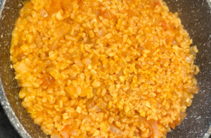 - Add the bulgur wheat, and tomato sauce to the pot. Stir well to combine.1 Cup Bulgur, ½ Cup Tomato Sauce