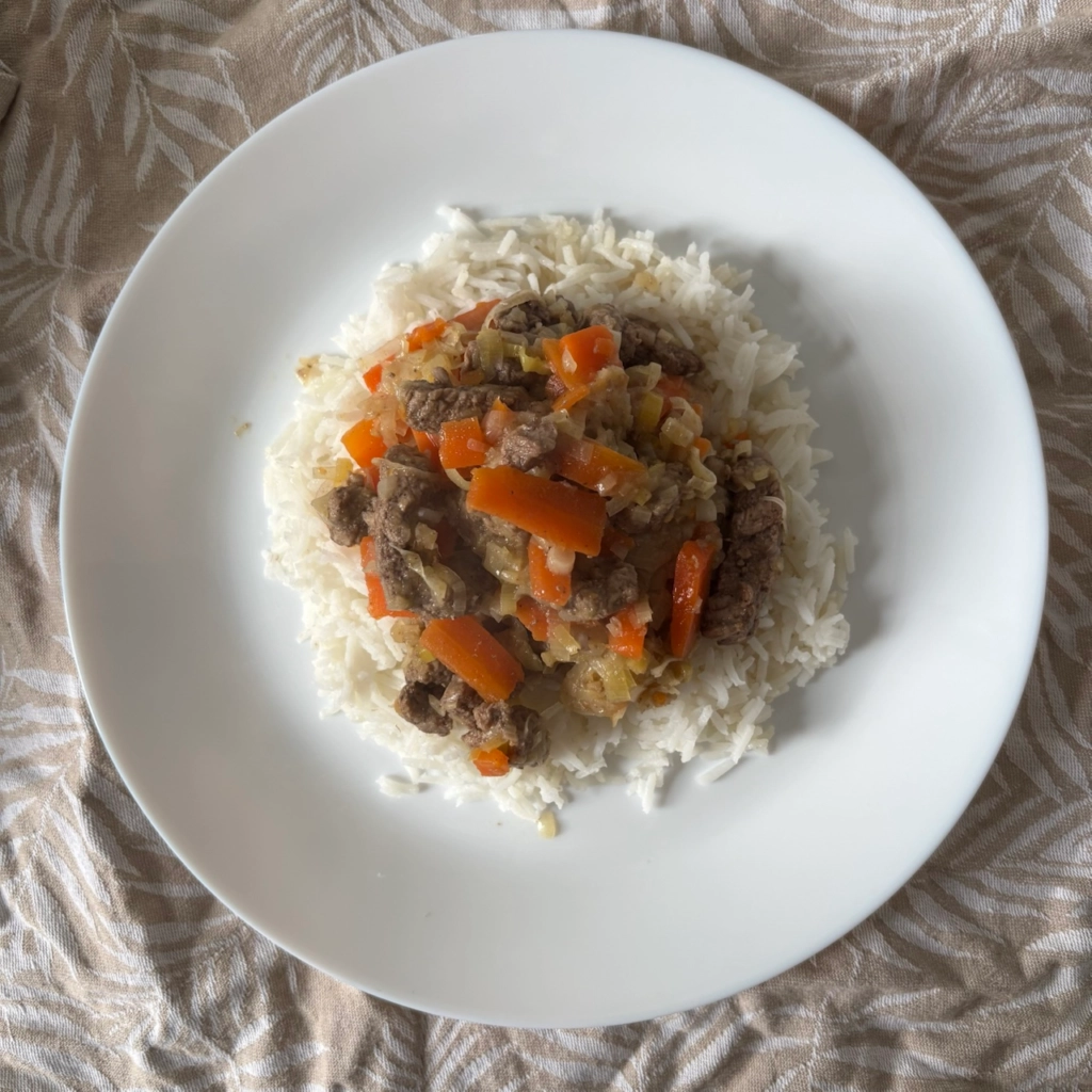 Serve the savory beef strips with creamy vegetables immediately over hot cooked rice.